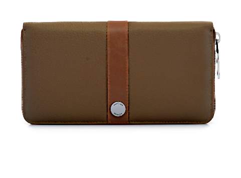 Portfel damski wykonany z najwyższej jakości usztywnianej, groszkowanej i licowej skóry bydlęcej, w jasnym odcieniu kawy z mlekiem. Całość zamykana na suwak. Wewnątrz 5 przegródek, z czego 1 zamykana na suwak (na monety), 8 miejsc na strony kredytowe, 1 siateczkowa kieszeń (np. na dowód osobisty), 1 kieszonka na wizytówki oraz 2 kieszenie dodatkowe. Wymiary: szerokość – 18,5 cm, wysokość – 10 cm, głębokość – 2 cm. Cena: 199,90 zł.