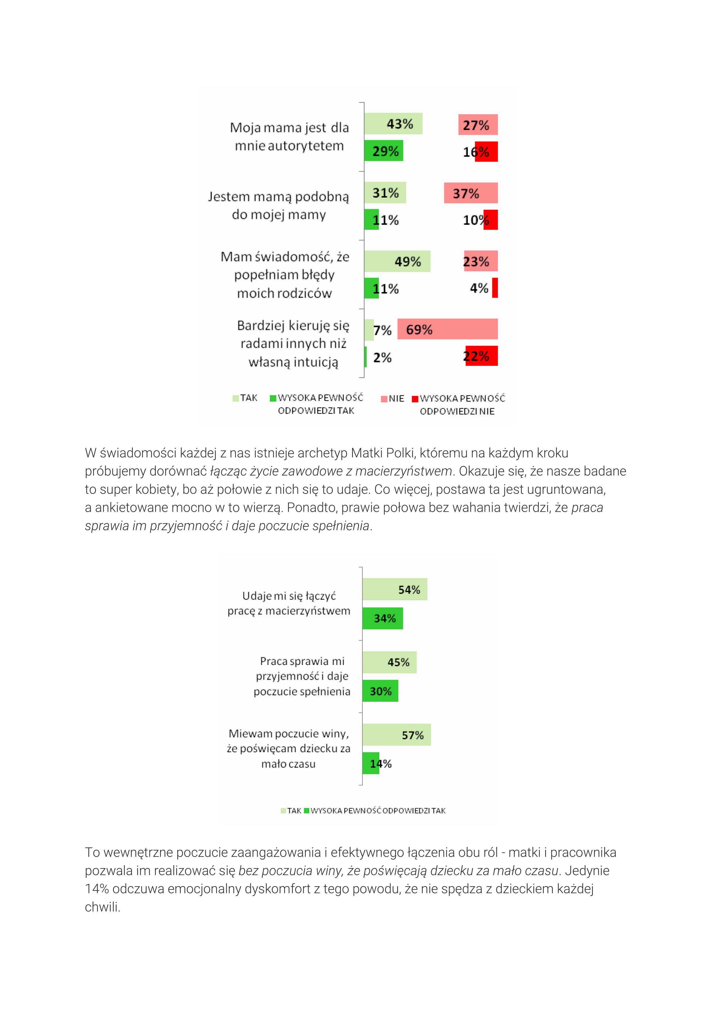 To wewnętrzne poczucie zaangażowania i efektywnego łączenia obu ról – matki i pracownika pozwala im realizować się bez poczucia winy, że poświęcają dziecku za mało czasu. Jedynie 14% odczuwa emocjonalny dyskomfort z tego powodu, że nie spędza z dzieckiem każdej chwili.