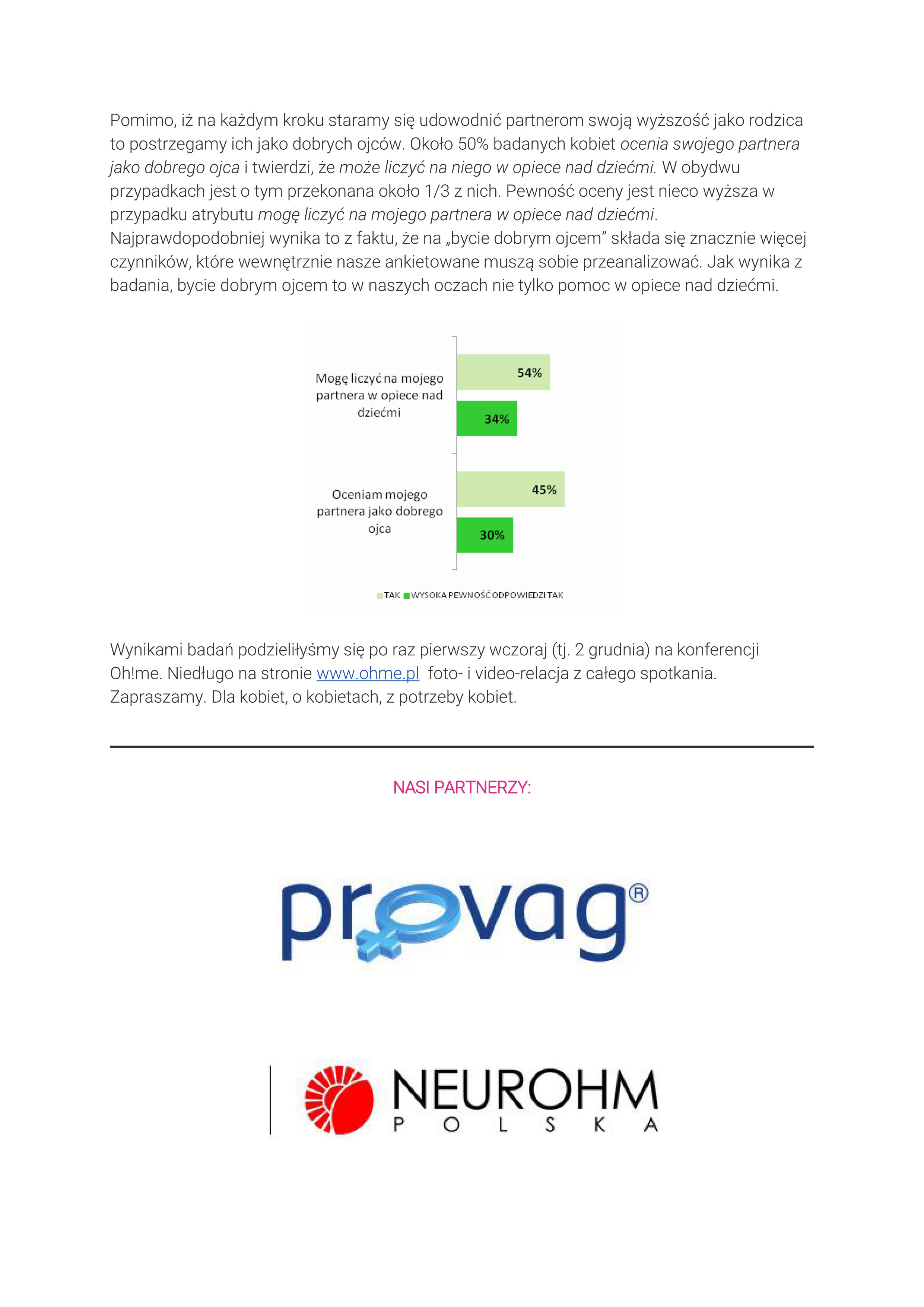 Pomimo, iż na każdym kroku staramy się udowodnić partnerom swoją wyższość jako rodzica to postrzegamy ich jako dobrych ojców. Około 50% badanych kobiet ocenia swojego partnera jako dobrego ojca i twierdzi, że może liczyć na niego w opiece nad dziećmi. W obydwu przypadkach jest o tym przekonana około 1/3 z nich. Pewność oceny jest nieco wyższa w przypadku atrybutu mogę liczyć na mojego partnera w opiece nad dziećmi. Najprawdopodobniej wynika to z faktu, że na „bycie dobrym ojcem” składa się znacznie więcej czynników, które wewnętrznie nasze ankietowane muszą sobie przeanalizować. Jak wynika z badania, bycie dobrym ojcem to w naszych oczach nie tylko pomoc w opiece nad dziećmi.
