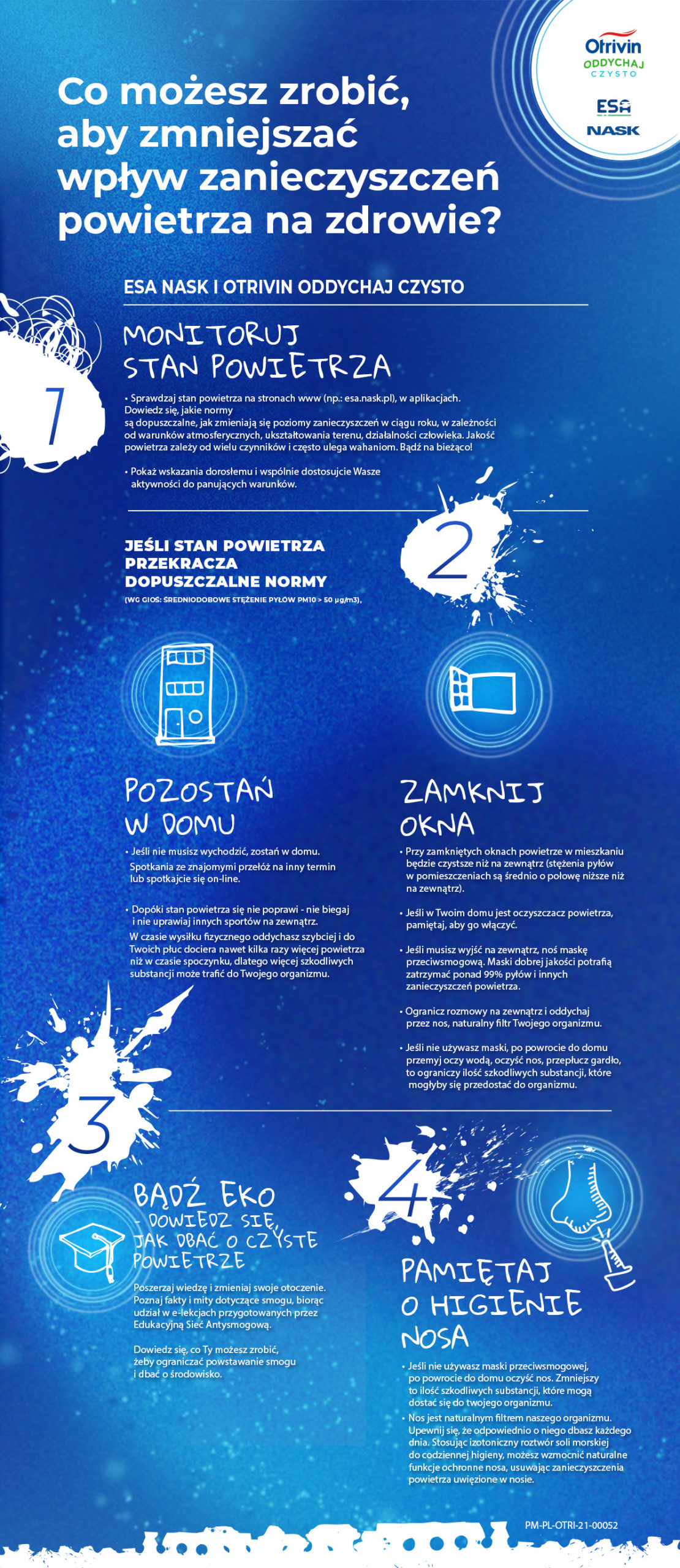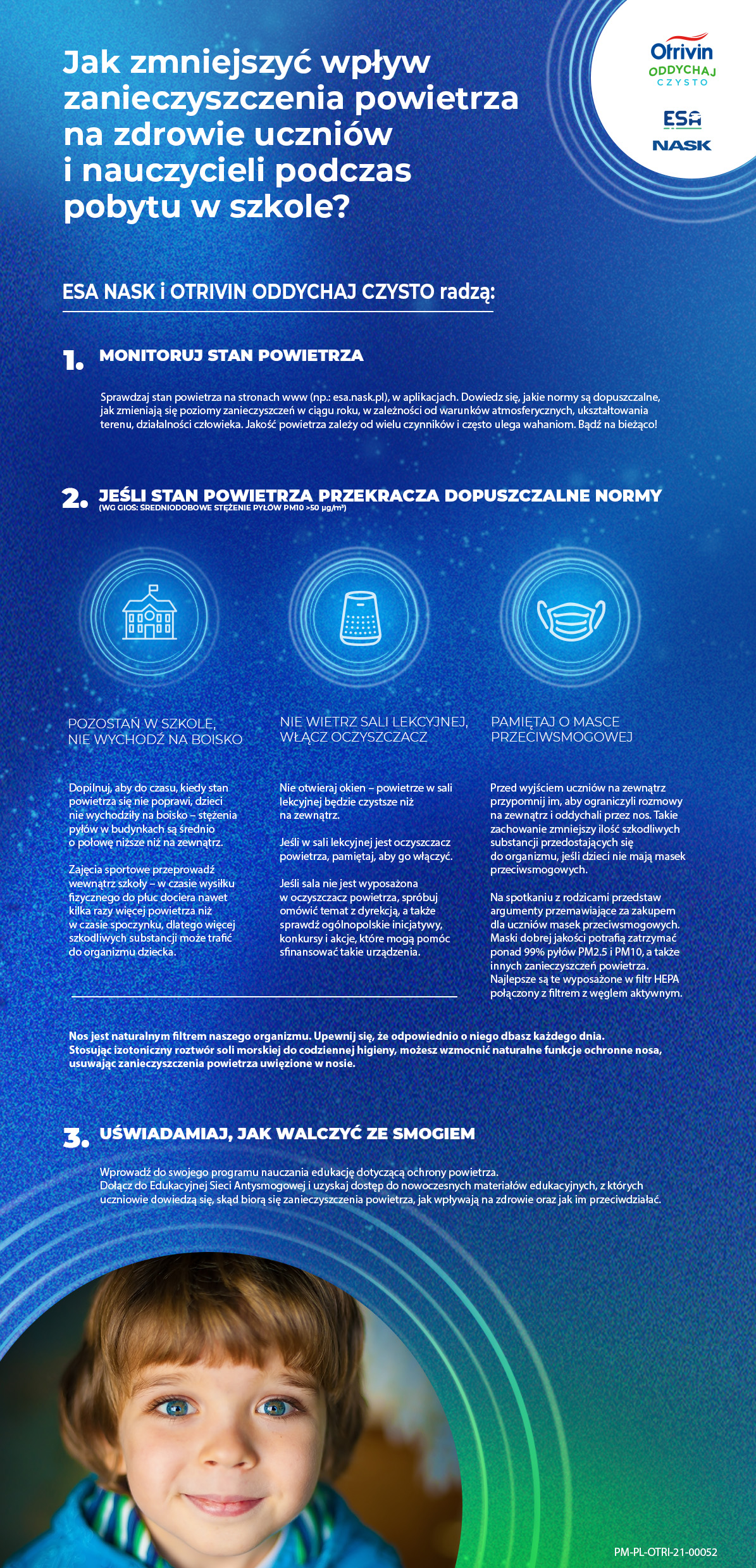 – Szkoły, jako instytucje kształcące dzieci i młodzież oraz ważne ośrodki opiniotwórcze, są doskonałym miejscem, by to w nich właśnie upowszechniać wiedzę na temat zanieczyszczenia powietrza i jego skutków dla zdrowia. Nasz przekaz kierujemy zarówno do dzieci, jaki i dorosłych – nauczycieli i rodziców. W ten sposób pomagamy całym lokalnym społecznościom w dostrzeżeniu i zrozumieniu problemów mających wpływ na jakość życia – mówi Barbara Leśniczak, z Państwowego Instytutu Badawczego NASK, partnera merytorycznego kampanii, który od lat realizuje program dla szkół Edukacyjna Sieć Antysmogowa. – Scenariusze lekcyjne oraz porady dla dzieci, nauczycieli i rodziców, przygotowane w ramach kampanii „Pomóżmy Dzieciom Oddychać Lepiej” zainicjowanej przez Otrivin Oddychaj Czysto, pomogą w łatwy i przystępny sposób przekazać wiedzę na temat zanieczyszczenia powietrza, które według WHO stanowi największe zagrożenie środowiskowe dla naszego zdrowia. Początek roku szkolnego to idealny moment na tego typu działania. Dzięki temu nauczyciele i rodzice będą mogli odpowiednio przygotować się na czas, kiedy stężenia smogu są największe, czyli sezon grzewczy – dodaje ekspertka.